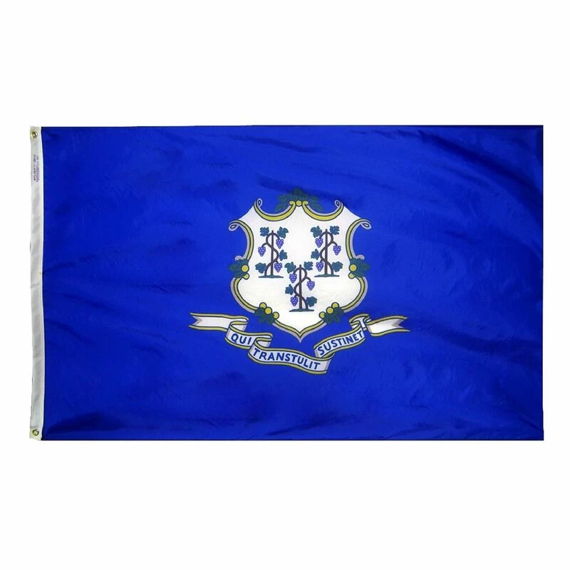 The Connecticut Flag, which is among one of the most ancient Flags, was originally used during the Revolutionary War when Connecticut troops used this seal on their Flag. The Flag consisting of a blue field with the arms in the center was officially adopted in 1895 after pressure from the Daughters of the American Revolution. On June 3, 1897 it was regulated that the arms should be in color in the center of a field of azure blue. The Flag was originally supposed to be ,squarish, but further regulations in 1957 said the Flag had to have proportions of 2: 3. All Annin Flagmakers flags are sewn in either South Boston, VA or Coshocton, OH. Annin’s superior quality is time-tested and meets the requirements of the most discerning buyer.