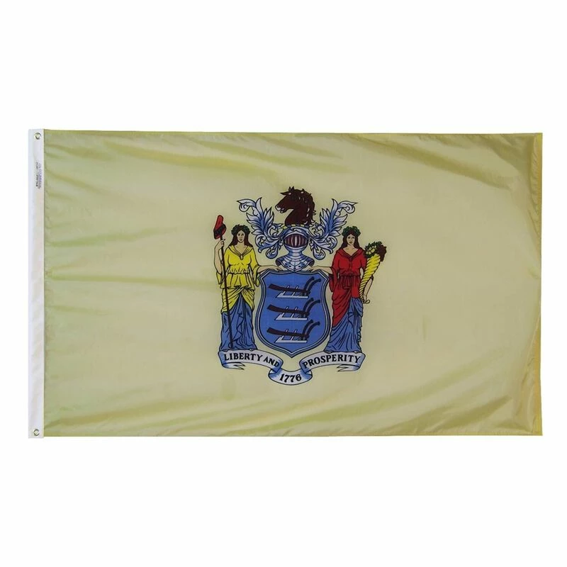 The New Jersey State Flag consists of a seal made from a coat of arms on a buff field. The coat of arms has a blue shield with three ploughs representing agriculture, above a scroll with the state motto, Liberty and Prosperity, and the date,1776. A horse’s head atop an armored helmet appear above the shield. The goddesses Liberty on the left, and Ceres, goddess of agriculture on the right, support the shield. All Annin Flagmakers flags are sewn in either South Boston, VA or Coshocton, OH. Annin’s superior quality is time-tested and meets the requirements of the most discerning buyer.