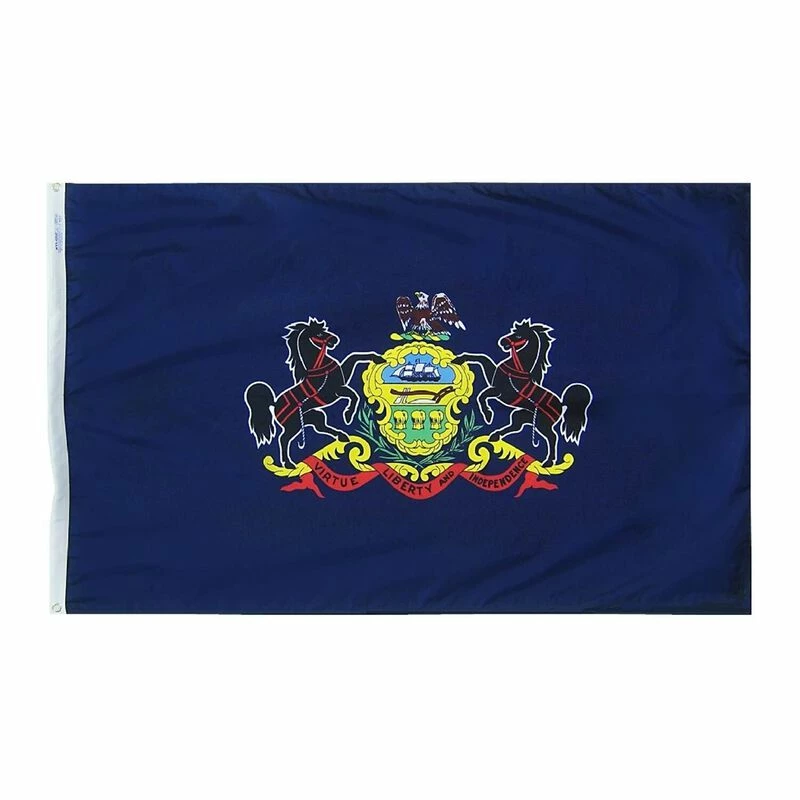 The Pennsylvania Flag consists of the state seal supported by horses with the state motto ,Virtue, Liberty and Independence, on an orange scroll below laurel sprigs on a blue background. An eagle stands above a shield with three sections containing images of a ship, a plough and three wheat sheaves. An eagle stands upon the shield. All Annin Flagmakers flags are sewn in either South Boston, VA or Coshocton, OH. Annin’s superior quality is time-tested and meets the requirements of the most discerning buyer.