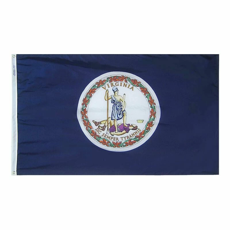 The Virginia state Flag consists of the state seal on a blue field. Two figures reside in the seal, the Roman goddess Virtus, and the dead body of Tyranny. Virtus represents Virginia dressed as an Amazon warrior, a sword and spear in either hand, her foot on the dead body of Tyranny. The state motto,Sic simper tyrannis, Thus ever to tyrants, lies below the scene, the state name above. All Annin Flagmakers flags are sewn in either South Boston, VA or Coshocton, OH. Annin’s superior quality is time-tested and meets the requirements of the most discerning buyer.