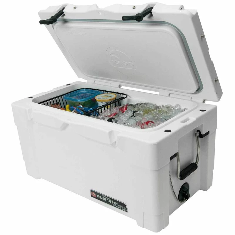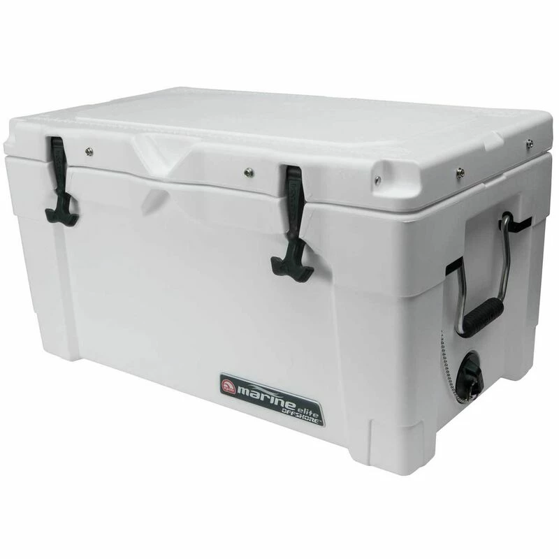 Designed with seamless rotationally molded construction for exceptional strength and impact resistance, the Marine Elite Offshore offers outstanding durability. Igloo’s Cooler Riser Technology™ enhances performance while the virtually indestructible stainless steel hinges provide durability. Robust, stainless steel swing-up handle comes with a cushioned finger grip for easy lifting and transportation and the rubberized T-handle latches secure the gasketed lid. UV inhibitors and infrared technology protect the cooler from sun damage so you can take it with you to all your outdoor festivities. The threaded drain plug enables easy draining and hose hook up while the fish keeper scale on the lid lets you measure your catch when fishing. Finally, with Igloo’s built-in molded lid ruler for quick and easy measuring, you can make sure the fish you caught is big enough to keep.
