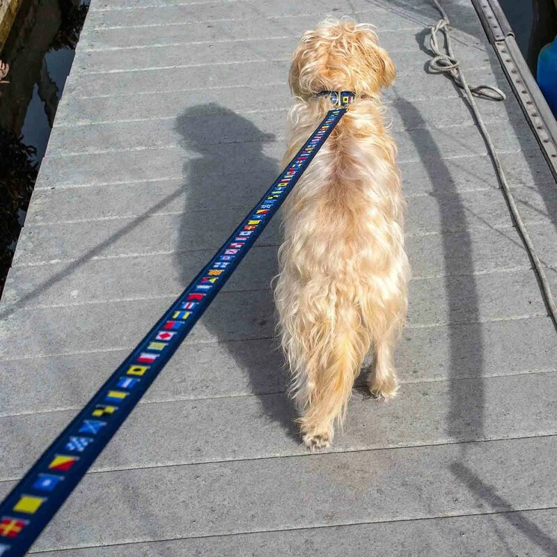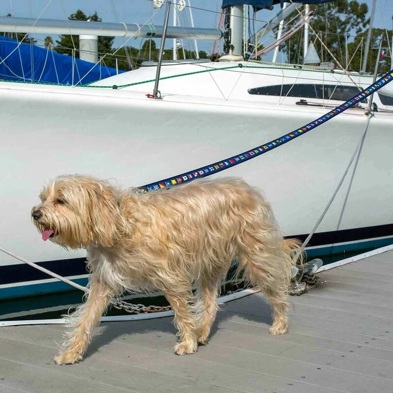 Your pooch will feel right at home around the water with this nautical code flags design leash. Featuring 1 1/4″ wide navy webbing this 6 foot leash also has a brass snap clip.
