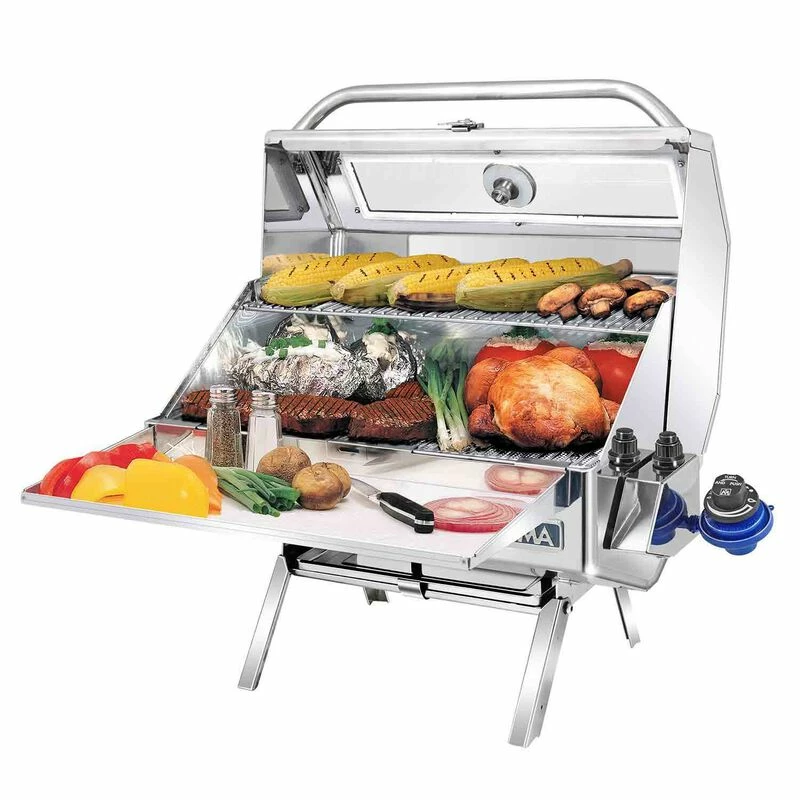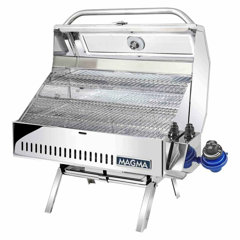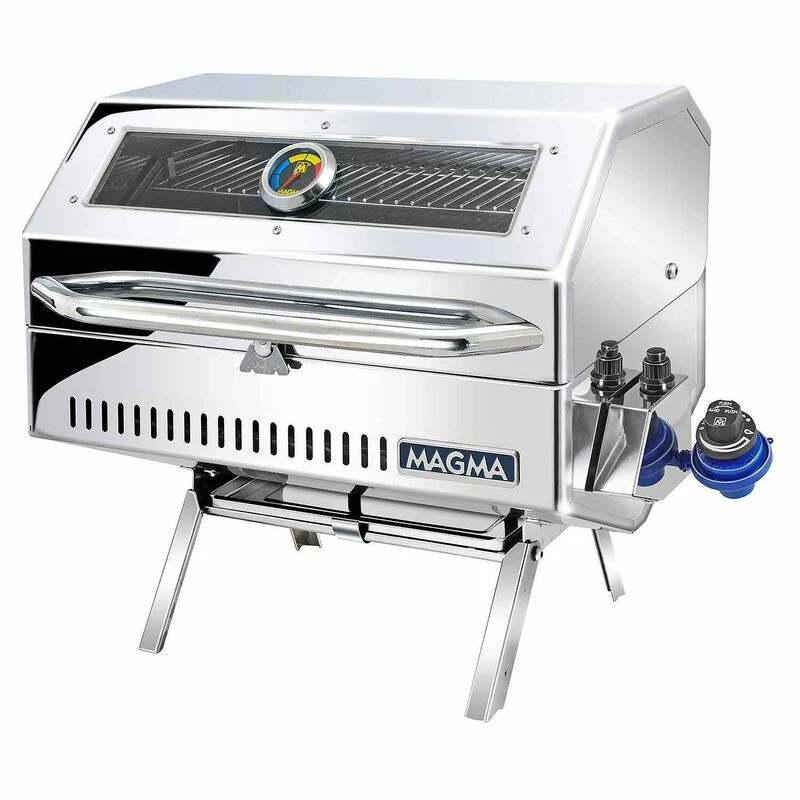 Comes equipped with fold-away table top legs for go anywhere use and a hermetically sealed thermometer. The swiveling control valve/regulator, designed to use 1lb. disposable propane fuel canisters, allows for quick, safe fuel canister exchanges or easily adapt grill to existing on-board low pressure propane (LPG) or natural gas (CNG) fuel systems. “Heavy Duty” mounting hardware is recommended. Magma mounts, serving shelf, and fuel canisters sold separately