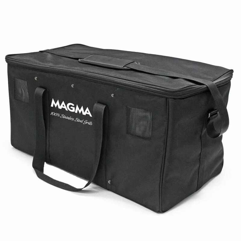 MAGMA Padded Grill Carrying Cases conveniently store and transport your grill and accessories. Designed to keep everything in one space-saving location. A large compartment holds the grill with pockets for storing a serving shelf, griddle or fish/veggie tray. Side pocket holds propane canisters. Thick padding for maximum protection and heavy-duty handles and shoulder strap for carrying from harbor to backyard barbecues in comfort.