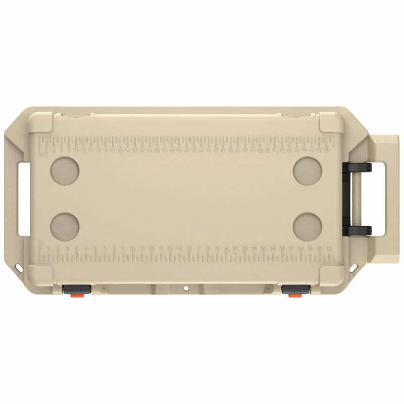 Pelican Elite 80 Quart Wheeled Cooler. Full 80 Quart internal acpacity. Up to 10 days ice retention, freezer grade gasket, 2″ polyurethane insulation. Press & Pull Latches (Wide for Gloved Use). Integrated Fish Scale on Lid. Heavy duty wheels.