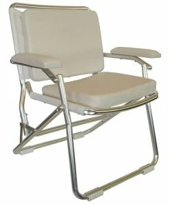European style folding deck chair, folds down flat. Locking bar keeps legs locked in place for extra stability. Can be used with or without the cushions. Includes back and seat cushions, made from heavy-duty weather resistant marine grade vinyl.